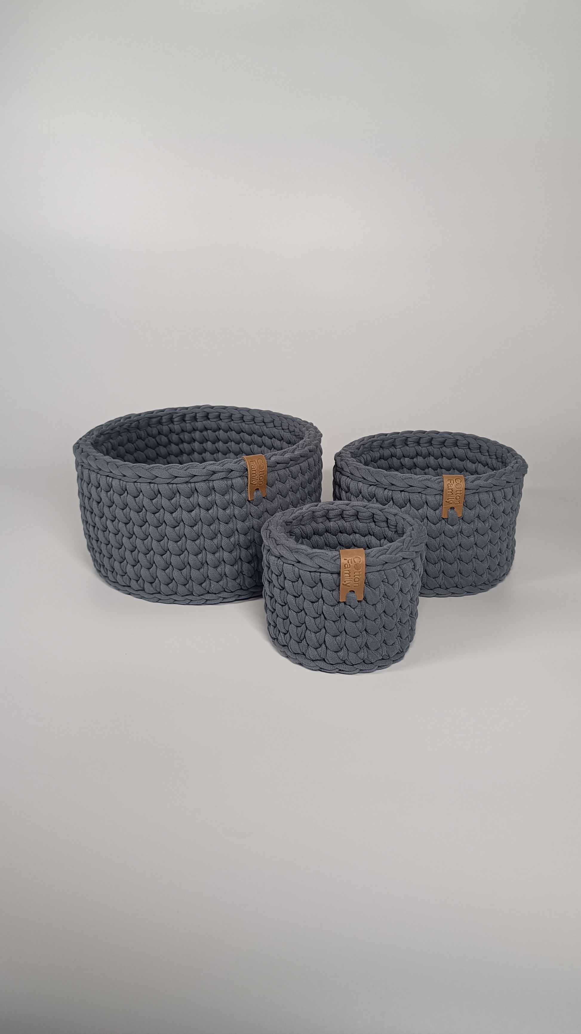 “CLASSIC” Set of 3 Round Crochet Organizer Baskets — Storm