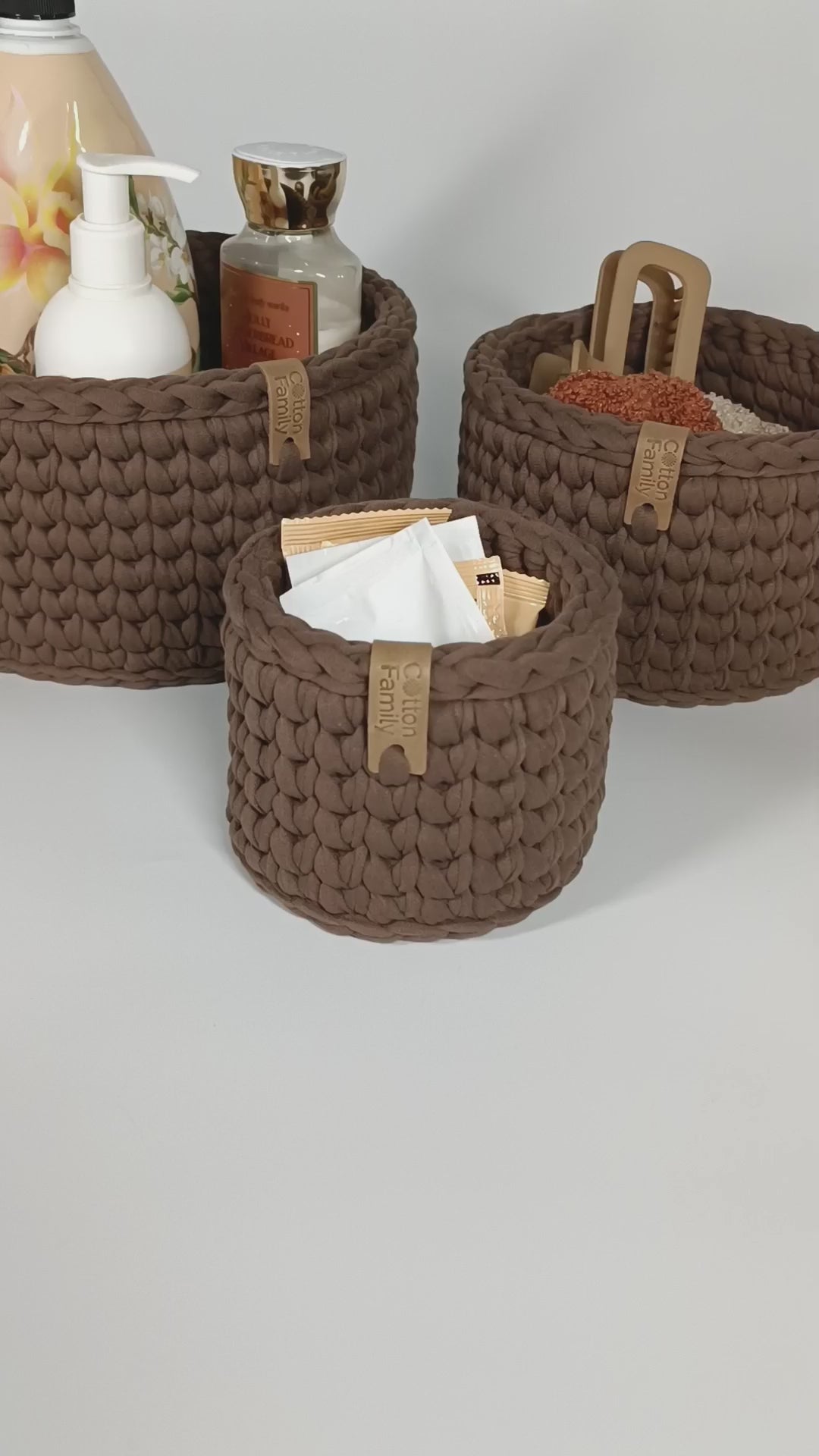 Fully crocheted with seamless knitted bottoms, the baskets maintain a smooth, structured silhouette while feeling soft and tactile.