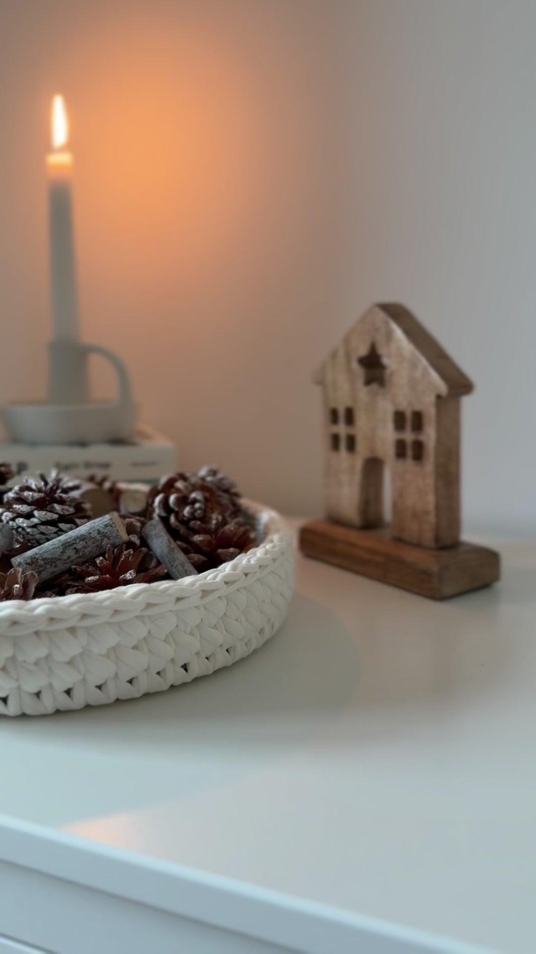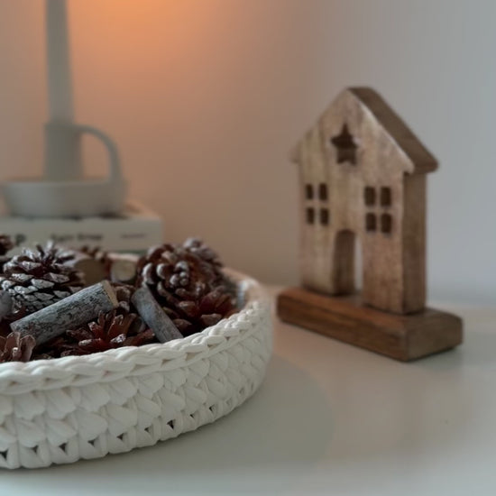 Its round wooden base adds natural stability, while the soft crocheted edge creates a warm, tactile finish that feels both elegant and inviting.
